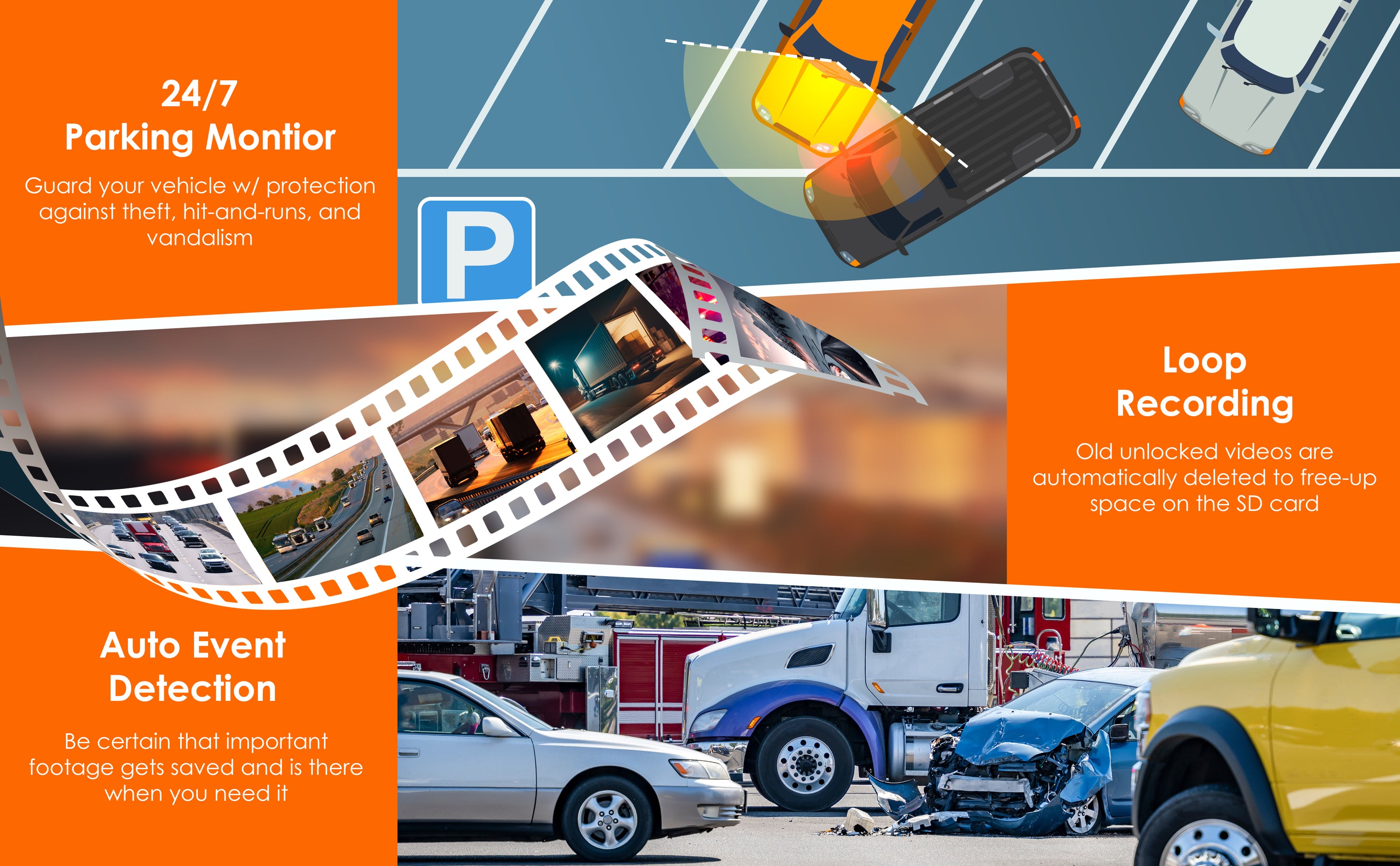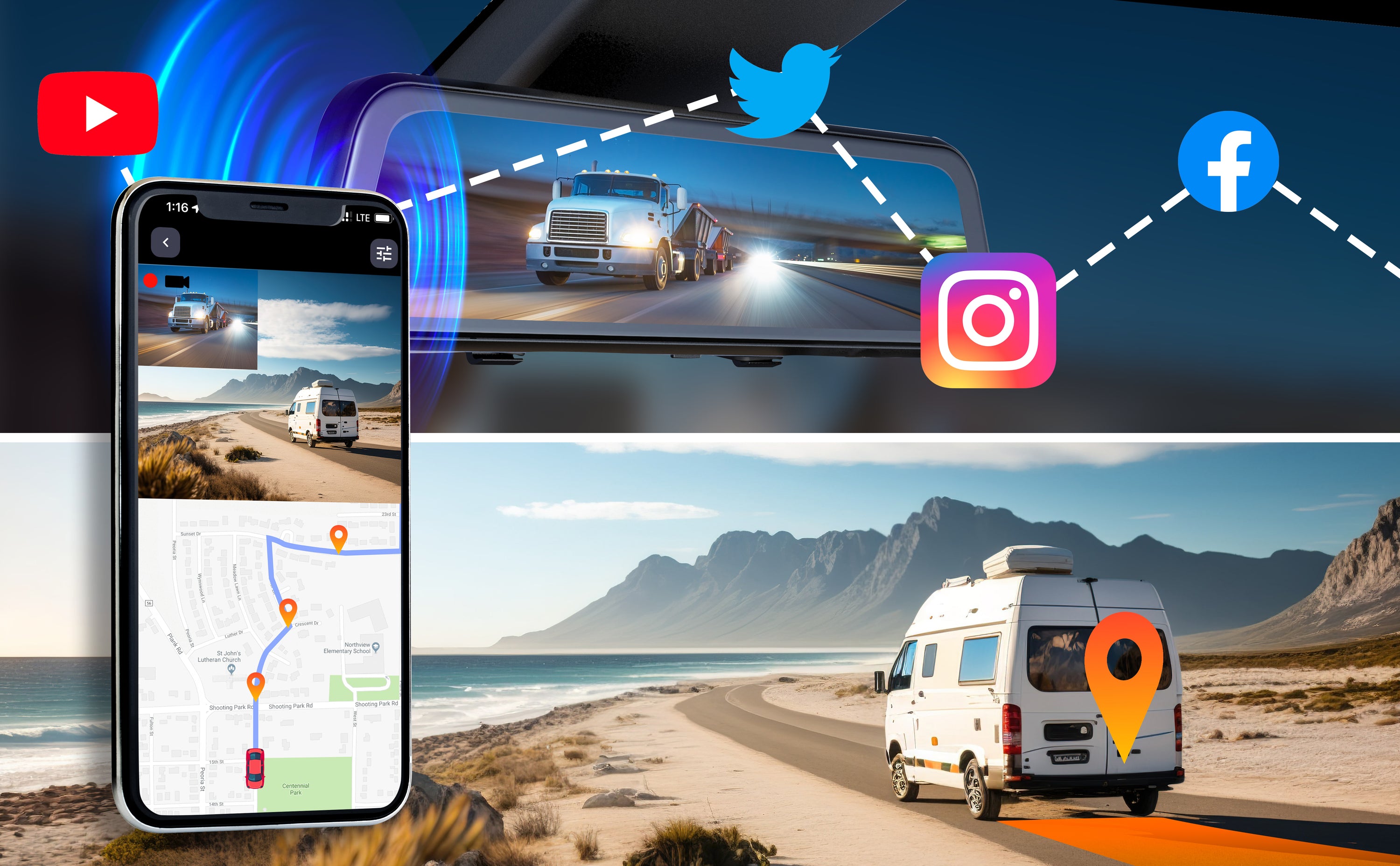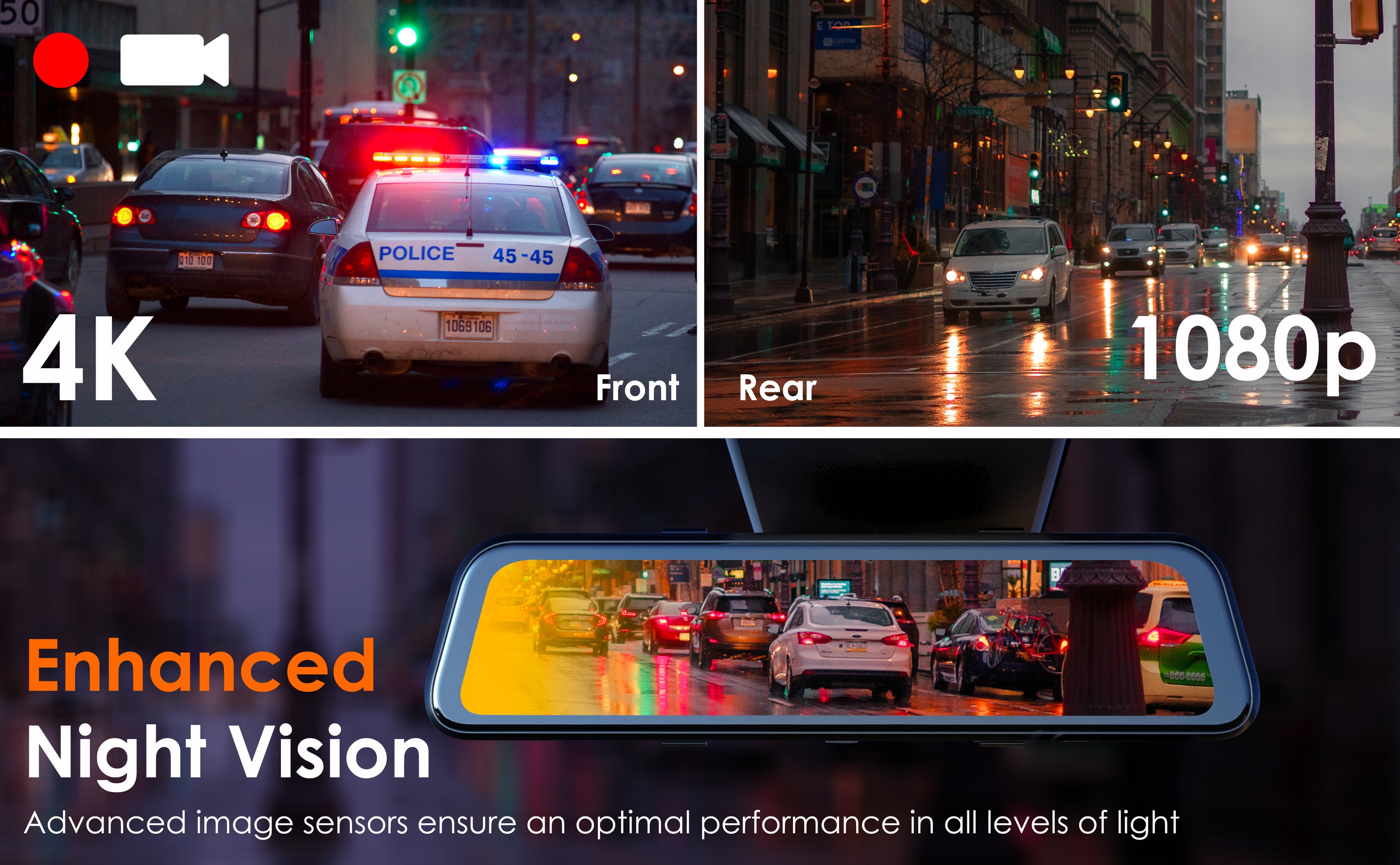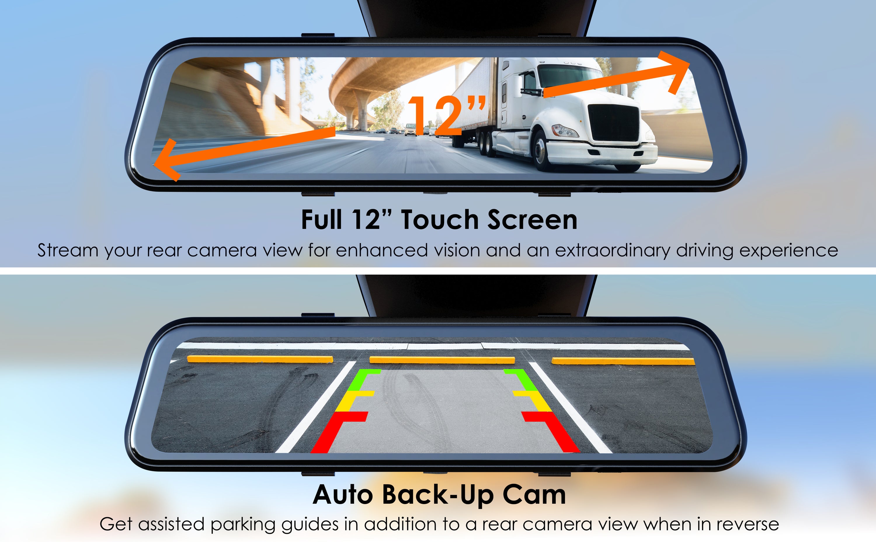 Pantalla táctil IPS de 12” | 4K + 1080p | Wi-Fi | GPS | BSD | Grabación en bucle | Cámara de reversa | Modo estacionamiento | Detección de colisiones | Admite hasta 256 GB