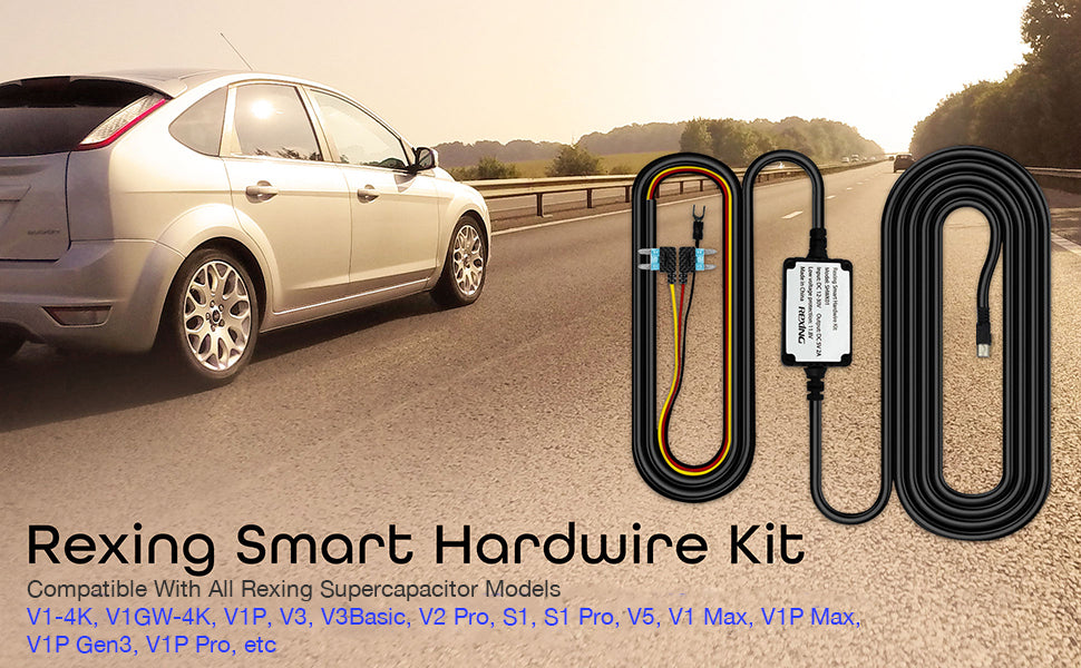 Kit de câblage intelligent Rexing avec port mini-USB pour tous les modèles de supercondensateurs Rexing : V1-4K, V1P-4K, V3 Basic, V3, V2 Pro AI, V1P-3, V1P Pro, V1 Max, V1P Max, V1GW-4K, V1PGW-4K, séries S1 et V5