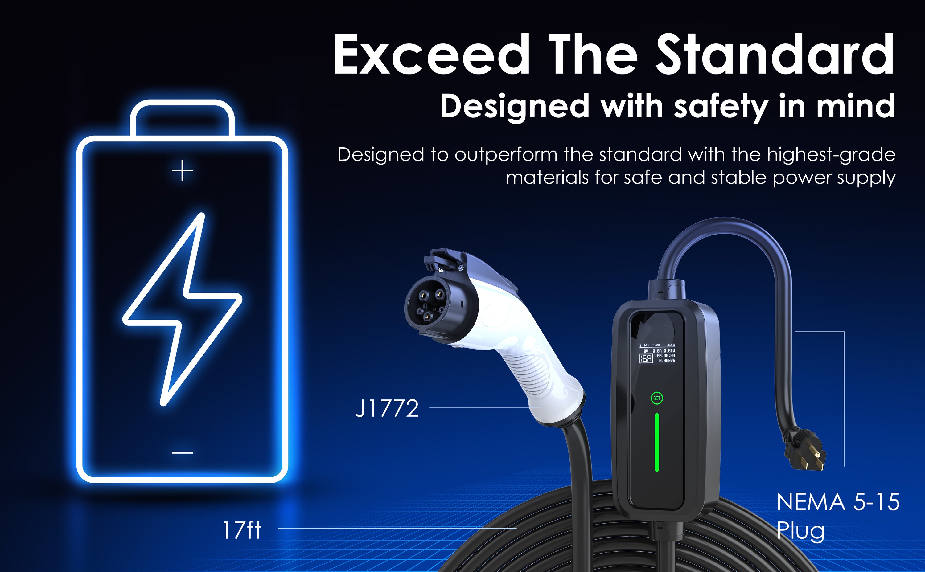 J1772 | 16A | 110V | NEMA 5-15 Plug | 17 ft Extension | LED Indicator | Over-heat Over-volt Protection | User-friendly Interface | Real-time Charging Updates