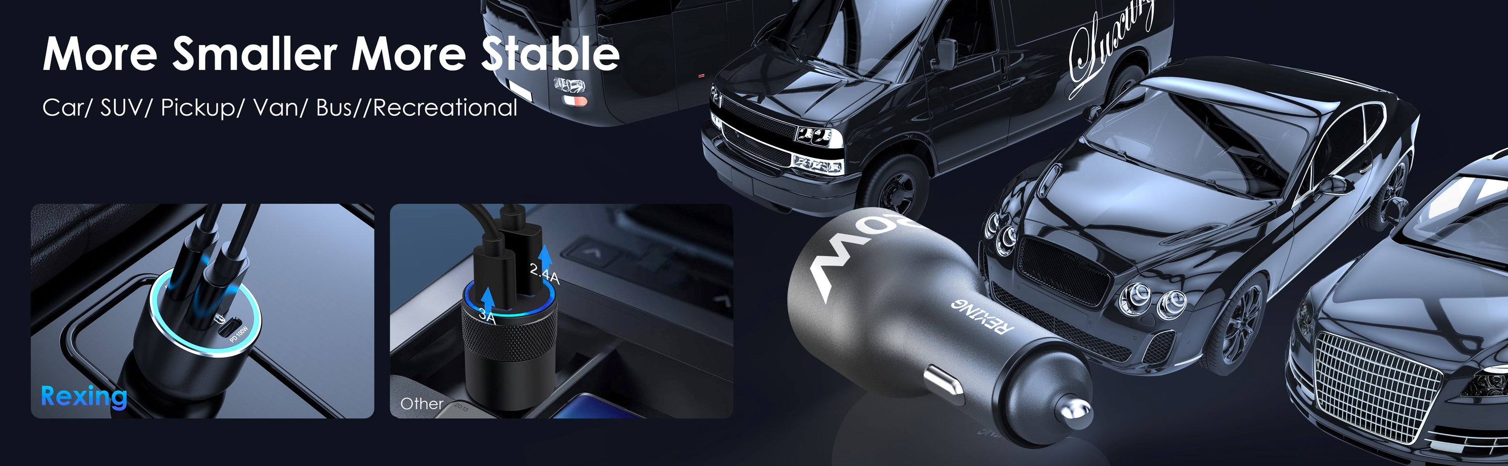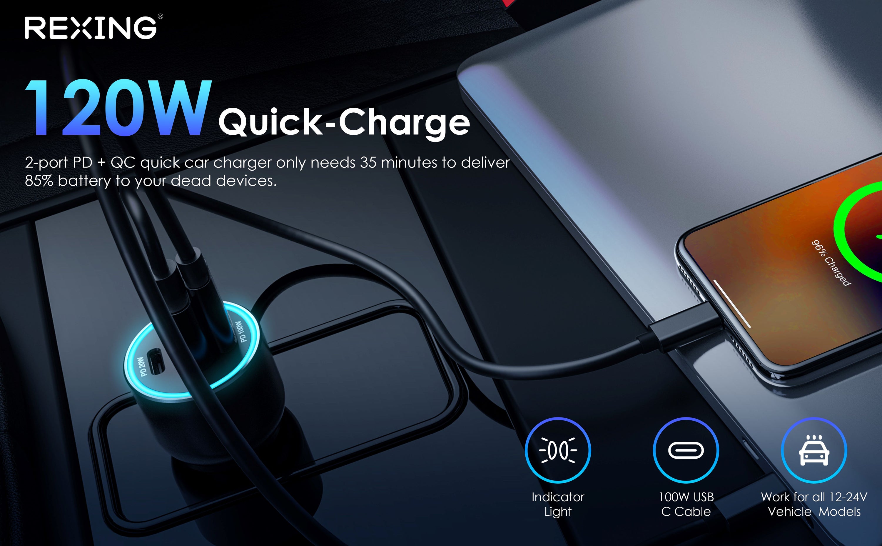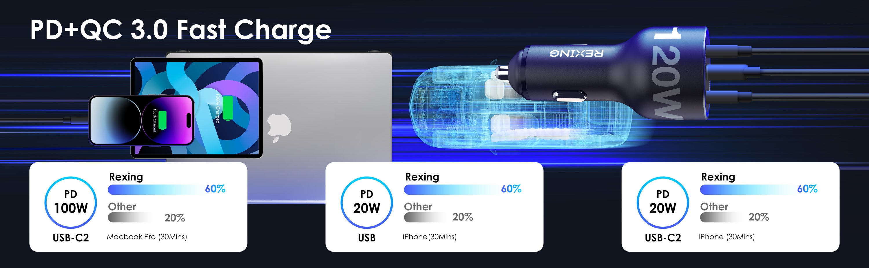- 120W Rapid Multi-Device Charging - Featuring one USB-A port and two USB-C ports, the RexingUSA 120W USB-C car charger powers up to three devices concurrently. With its fast charging capabilities, this car adapter charges an iPhone to 100% in approximately 1.5 hours, an iPad Pro/Air in around 2 hours, or a MacBook Pro in under 2 hours.