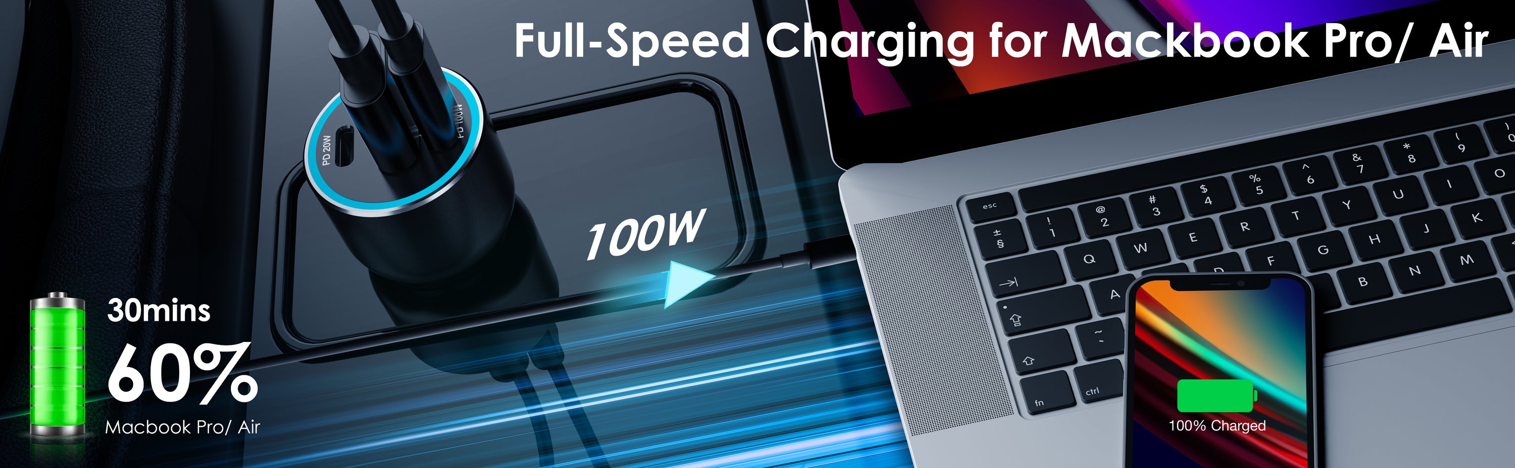 - Package Contents - This car charger set includes a 120W USB-C car charger and a 100W USB-C cable. The cable features a built-in E-Marker chip that ensures fast charging and comprehensive protection for both the device battery and adapter. It supports 60W and 100W at 3A and 5A, as well as data syncing and a 480 Mbps transfer speed.