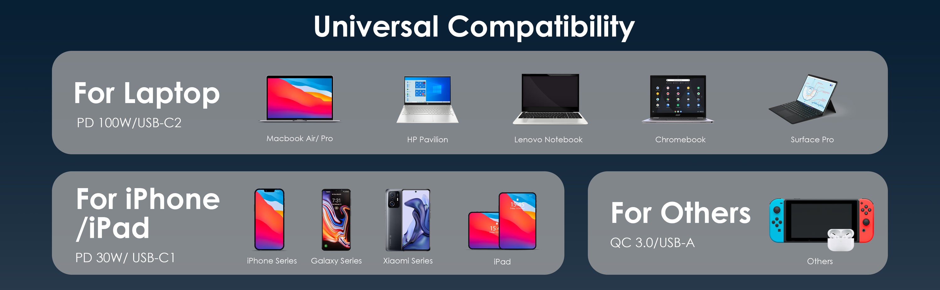 - Wide Compatibility - Suitable for iPhone, Galaxy, iPad, MacBook, ChromeBook, Lenovo, Dell, HP, Google Pixelbook, LG, Kindle Fire HD 10, Switch, Bluetooth receivers, dash cams, and more devices. Designed to accommodate most car models with a 12V-24V cigarette socket.