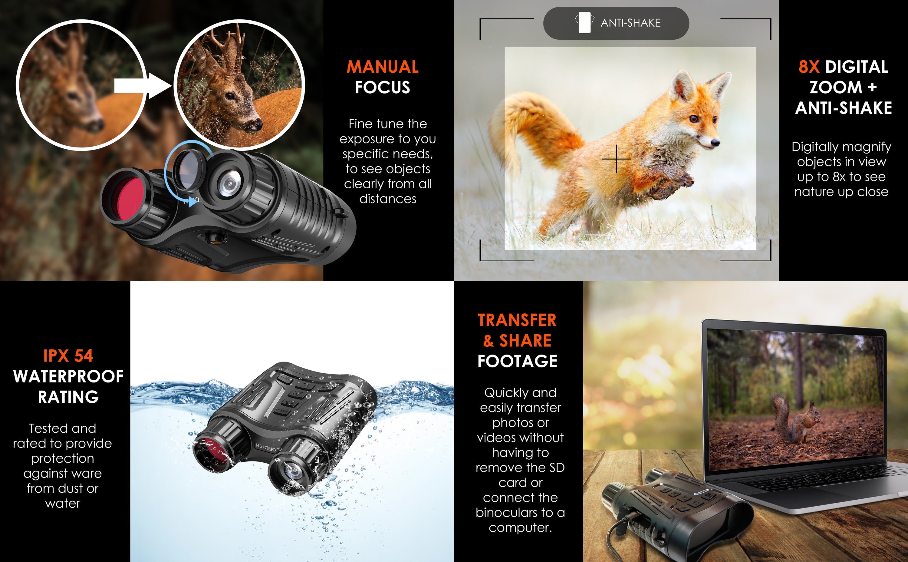 - Video Recording & Photos - Pro digital binoculars are equipped to record videos and take photos. You’ll be supported in capturing nature in whatever you like day or night.