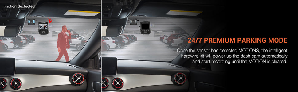 - Premium Parking Mode - Once the sensor has detected MOTIONS. The intelligent hardwire kit will power up the dash cam automatically and start recording until the MOTION is cleared.