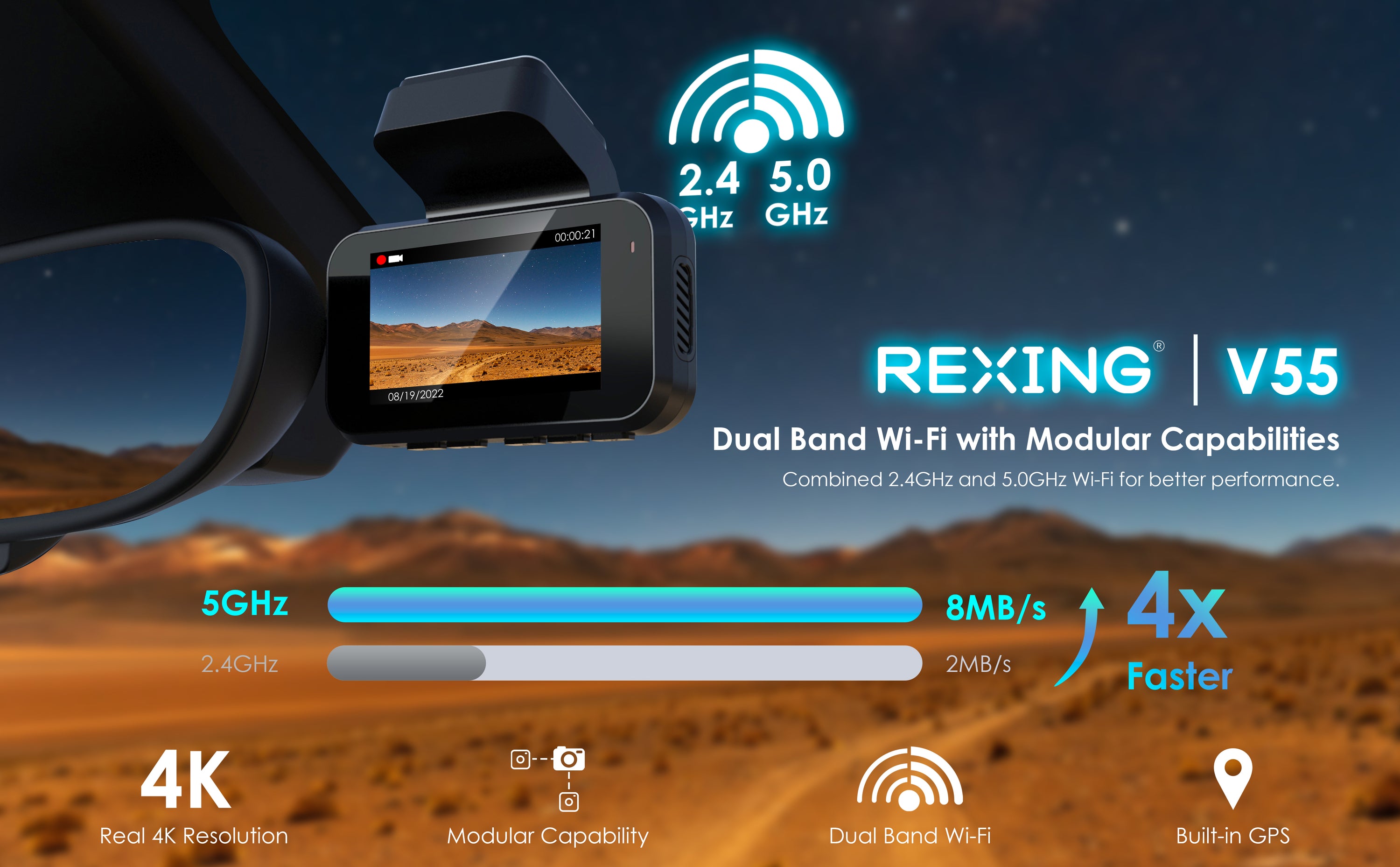 Rexing V55 Dash Cam – 4K Modular Capabilities, 5.0 GHz Wi-Fi, and GPS Car Dash Camera Recorder