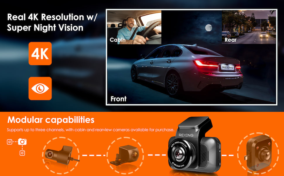 The V55 is a 3840 x 2160@30fps resolution front camera with an adjustable lens that is compatible with the Rexing Rear-View Camera Module to add cameras. Personalize your dash cam and choose any of 3 different rear camera views from Rear, Cabin, or Rear Window view.