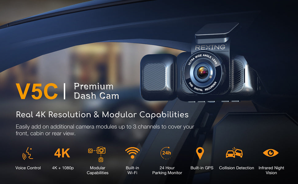 REXING V5C Plus Dash Cam Front 4K & 1080p Cabin Camera w/ Modular Capabilities, WiFi, and GPS